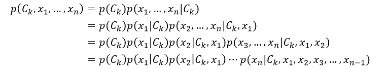 我们再来看式2中的分子部分,它是联合概率模型p(Ck,x1,…,xn)。基于链式法则,并重复应用条件概率的定义,这个联合概率模型可以重写为: