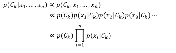 由于是“朴素”的贝叶斯,对于分类Ck来说,特征Fi是有条件的独立于特征Fj的,i≠j。因此,这意味着p(xi|Ck,xj) = p(xi|Ck),p(xi|Ck,xj,xq) = p(xi|Ck),p(xi|Ck,xj,xq,xl)= p(xi|Ck),以此类推,其中i≠j,q,l。则式2又可重写为: