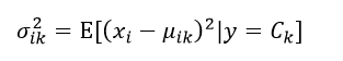 这里一共有2nK个参数,这些参数都需要独立的去估计。估计的方法仍然可以采用极大似然估计。均值μik的极大似然估计为: