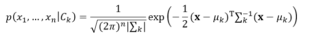 式中,μk表示第k个分类所对应的n维均值向量,|∑k|表示第k个分类所对应的n×n的协方差矩阵∑k的行列式的值。