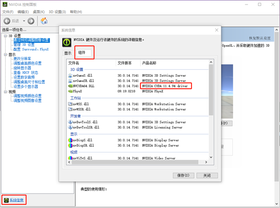 打开NVIDIA控制面板(可搜索"NVIDIA Control Panel"),【系统信息】-【组件】,可看到NVIDIA驱动所支持的最高CUDA版本(即driver API版本),使用时版本取决于环境中的runtime(运行时) API版本。若没有驱动 :https://www.nvidia.cn/Download/index.aspx?lang=cn