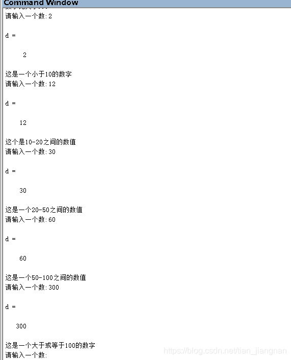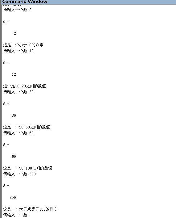 for i = 1:10d=input('请输入一个数:')if(d<100)if(d<10)disp('这是一个小于10的数字') elseif(d <= 20)disp('这个是10-20之间的数值')elseif(d < 50)disp('这是一个20-50之间的数值')elsedisp('这是一个50-100之间的数值')endelsedisp('这是一个大于或等于100的数字')end