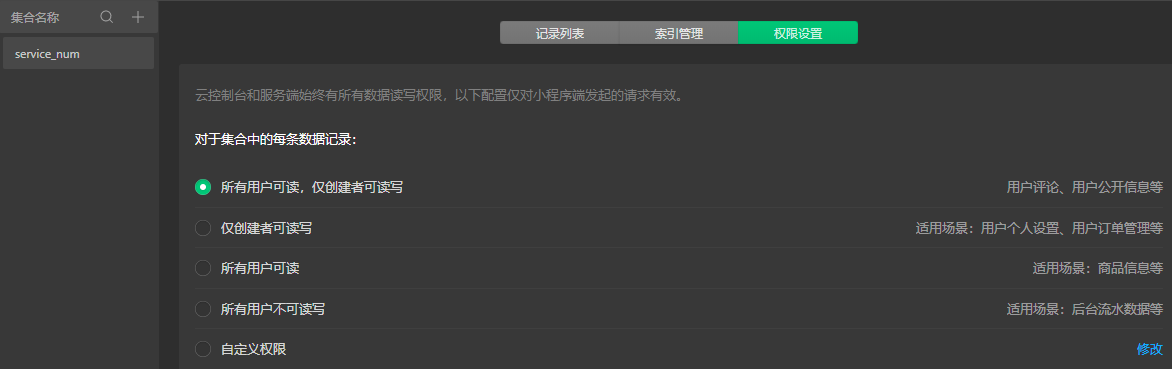 1、创建数据库集合:service_num;更改集合权限设置