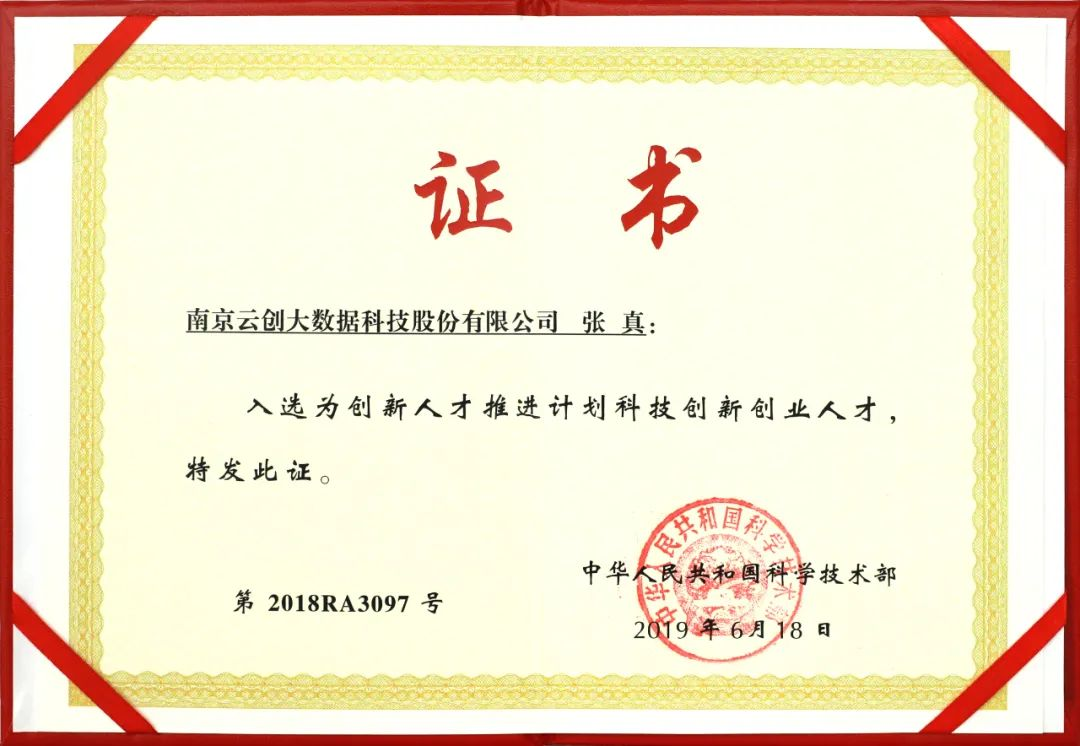 近日,经申报推荐、形式审查和专家评议等环节,云创大数据张真董事长入选为“创新人才推进计划科技创新创业人才”,并获得科技部授予的创新人才推进计划证书。