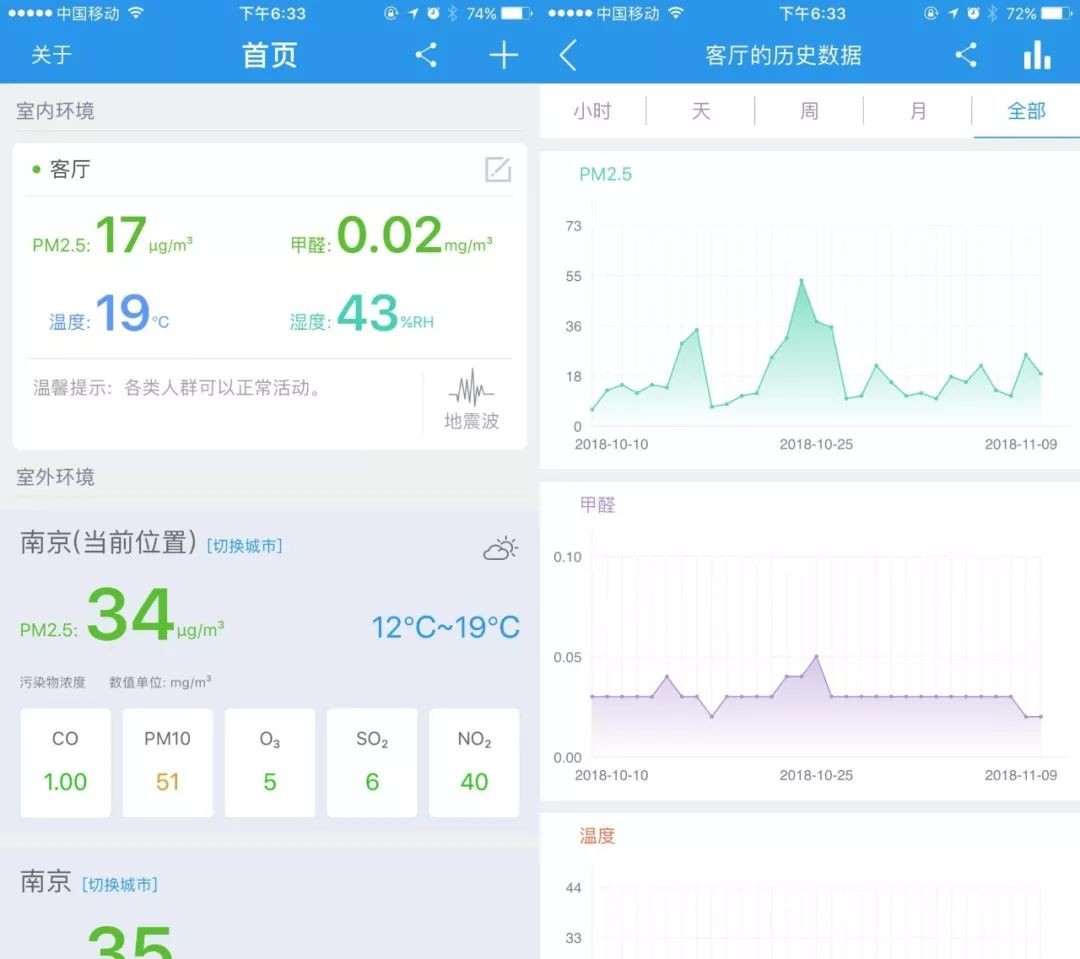 通过APP,即可随时查询环境猫实时数据与历史数据,有的放矢地净化空气中的污染物,确定是否开关窗户、是否开净化器,这样室内环境才能常净常新。