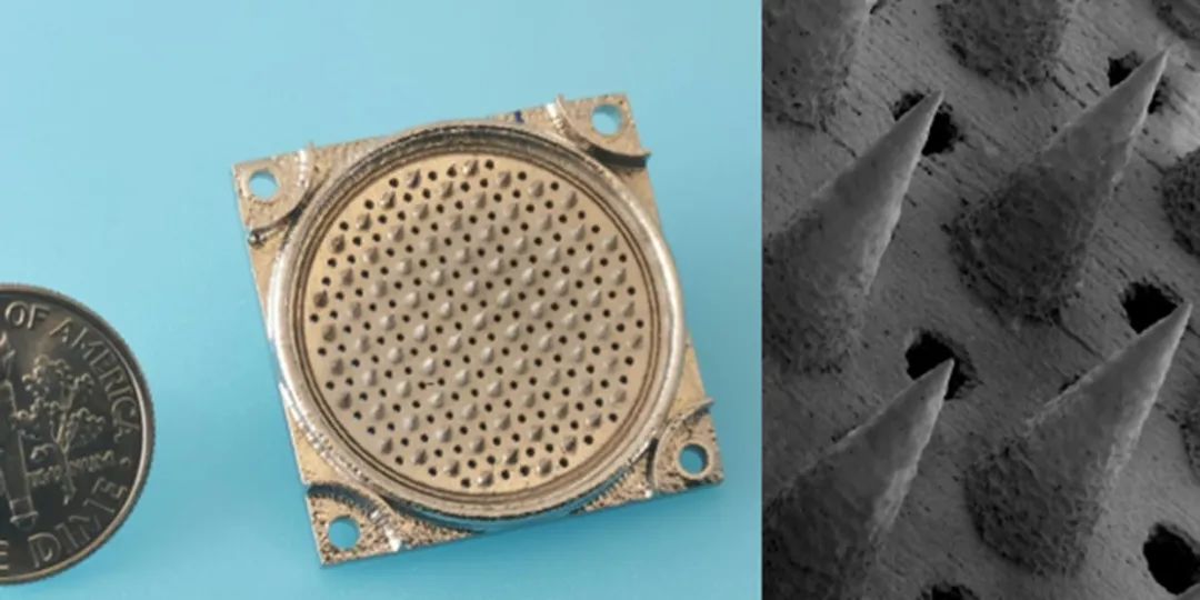 在研究中,研究小组建立了两种微机电系统(MEMS)设计:一种采用基于粘结剂喷射SS 316L的发射极阵列,另一种采用丙烯酸聚合物制成。这些设备本身都具有流体连接器,储液器和外壳,外壳包括嵌入式锥形外部发射器阵列。