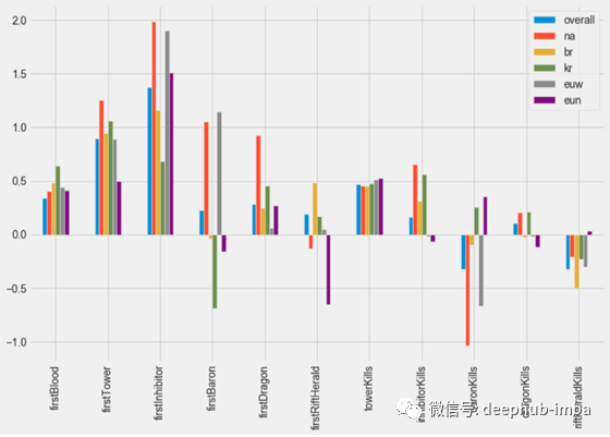 回归系数描述预测变量和目标变量之间的关系。例如,当我们看上面的一血预测变量时,第一个拿到一血的队伍是对比赛结果的适度预测,因为第一个拿一血的队伍更有可能获胜。另一方面,峡谷先驱的击杀实际上是在相反的方向上相关的(除了EUNE),并且获得更多峡谷先驱击杀的队伍更有可能输掉。