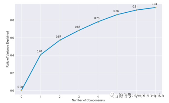 我现在很想知道数据中的方差是如何用较少的特征来解释的,而不是我用来预测游戏结果的10个特征。在这种程度上,我进行了主成分分析,以了解我可以将数据简化成多少特征,同时保留大部分的方差: