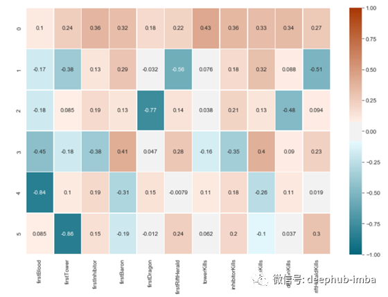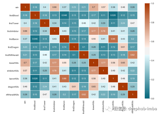 从我的关联热图来看,无论一个团队是否摧毁了第一个兵营,一个团队推掉了多少塔,以及一个团队摧毁了多少兵营都与获胜有最高的相关性。