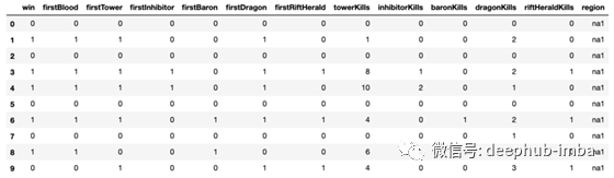 在前7列中,0表示“False”,1表示“True”,而在后面的列中,单元格中编码的数据表示事件发生的次数。每行都包含了一场排位比赛中的一支队伍的统计数据。例如,在第一排,没有获得任何目标的团队首先输掉了整个比赛。