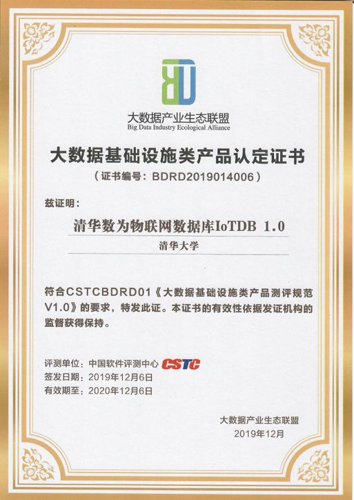 2019年12月,由清华大学软件学院自主研发的“清华数为物联网数据库IoTDB”在由大数据产业生态联盟、联盟大数据与产品质量保障工作组、中国软件评测中心组织的专业评审活动中被评为“优秀大数据产品”,并获得大数据基础设施类产品认定证书。据悉,包括IoTDB在内,本次评审共选出6项优秀大数据产品。