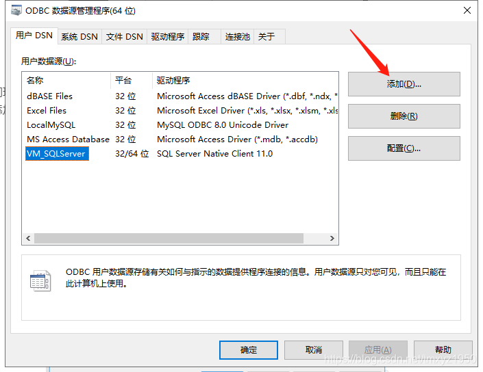 我们现在工具箱中找到ODBC管理器,自动打开系统自带的管理器 ,在用户DSN页面上,我们点击添加: