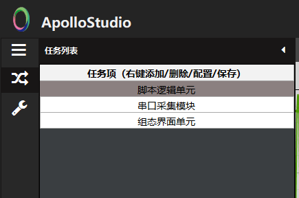 下面我们来看下ApolloStudio的简单配置,先添加脚本单元以及串口采集单元,串口采集单元设置如下(需根据实际情况调整串口参数使其与Arduino端的串口配置保持一致):