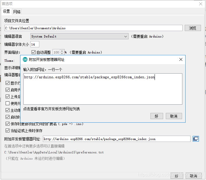 我们将在Arduino IDE中对NodeMCU进行操作,所以我们需要先在Arduino IDE中添加所需要的驱动固件以及对应的开发库(这里我们使用的Arduino IDE版本为1.8.8),首先我们先在Arduino IDE中的 文件 》 首选项》 附加开发板管理器网址中添加以下资源库路径: