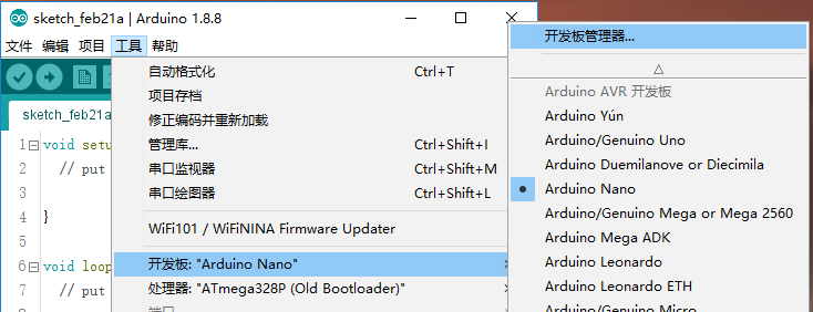 然后打开 Arduino IDE 的工具》开发板》开发板管理器: