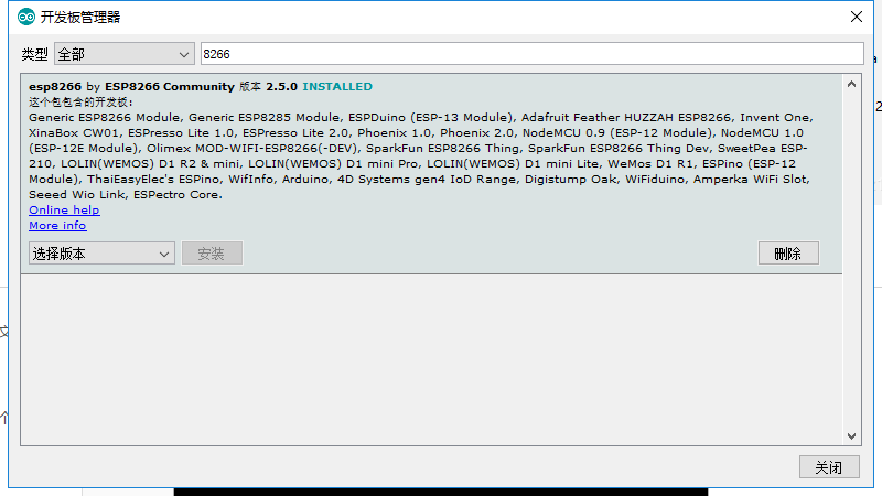 在搜索框内搜索“8266”,然后安装开发板固件包: