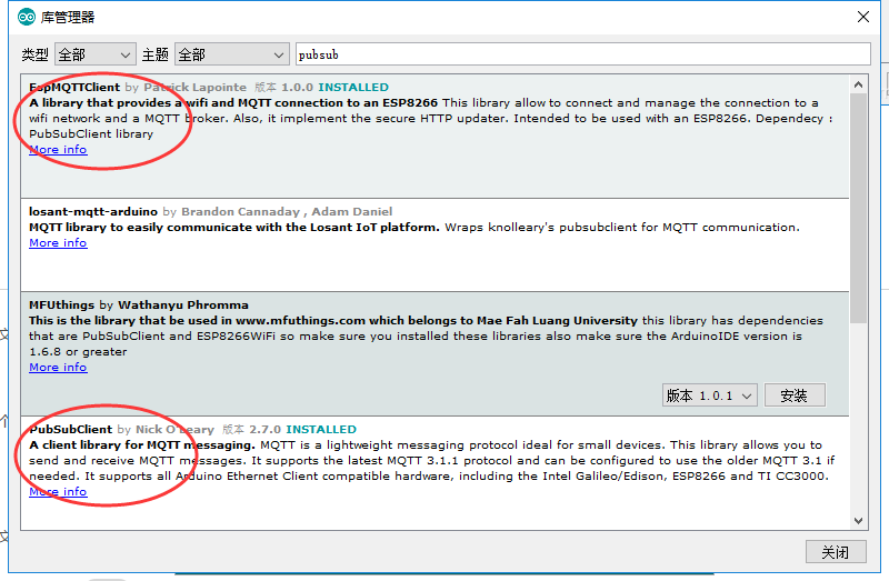 然后我们打开Arduino IDE中的工具》管理库,搜索“pubsub”,安装图示两个库文件:EspMQTTClient以及PubSubClient即可。