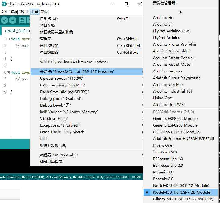 使用之初,我们需要设定我们所使用的NodeMCU板卡调取对应的驱动固件,这里我们选择了NodeMCU 1.0(ESP-12E Module):