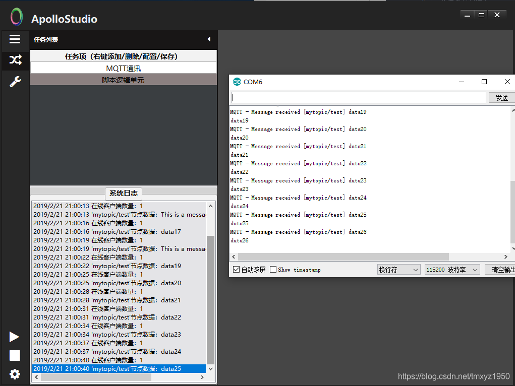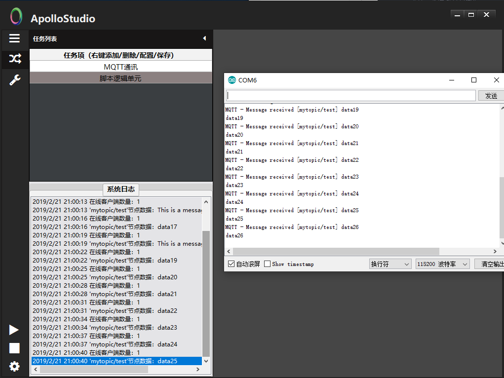 这里我们结合两者进行实验,在NodeMCU篇中,我们提及NodeMCU订阅了一个名为“mytopic/test”的主题,这里我们在ApolloStudio中进行显示,并每次推送数据 到节点,通过Arduino IDE的串口调试工具对其进行监视。