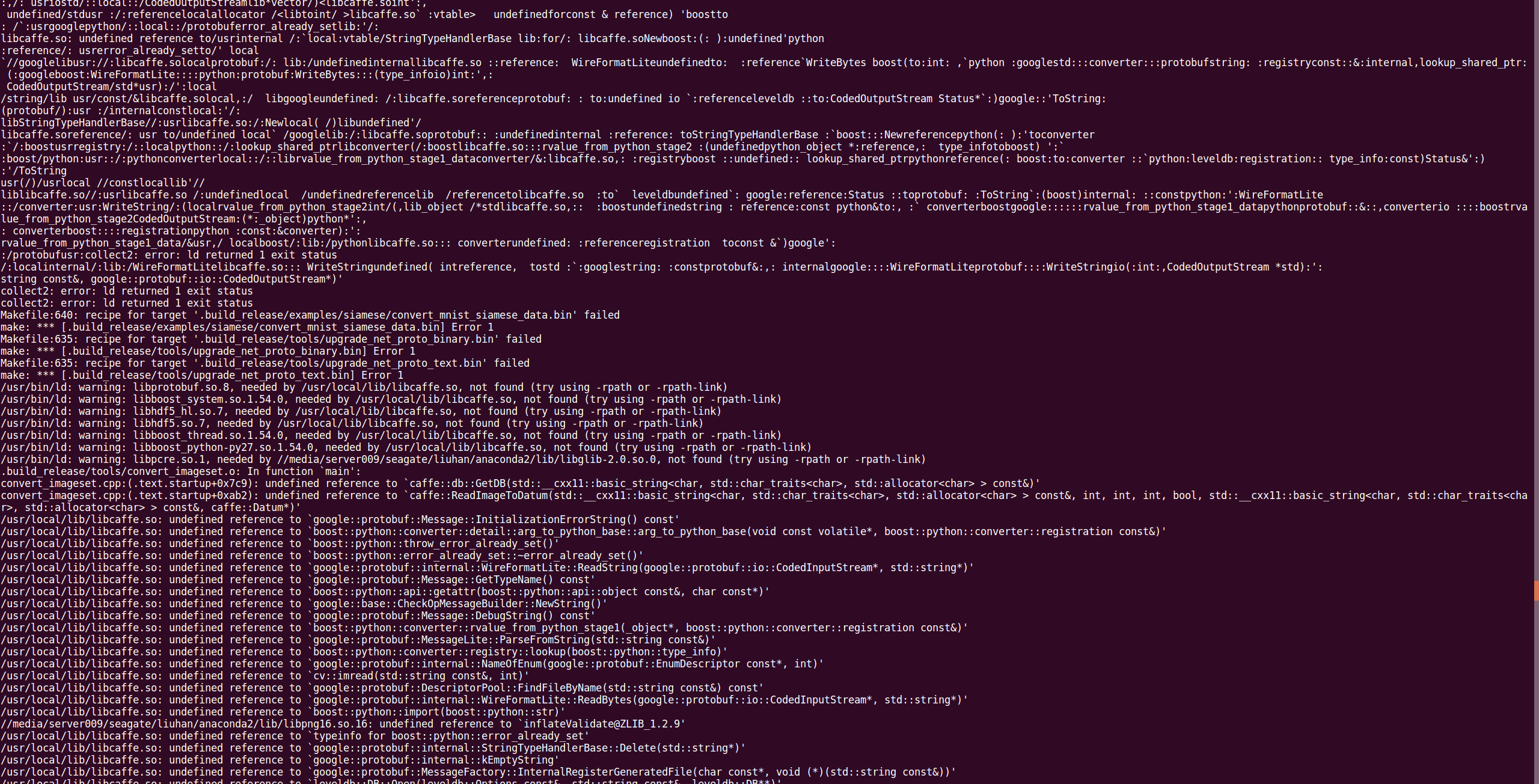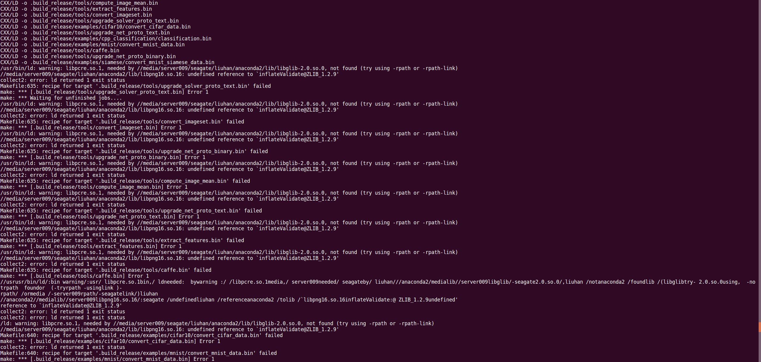 在Makefile.config第一行加入:LINKFLAGS := -Wl,-rpath,/media/server009/seagate/liuhan/anaconda2/lib