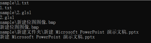 {//主函数std::string filePath = "sample";std::vector<std::string> files;std::vector<std::string> ownName;//vector<string> filesname; //获取该路径下的所有文件路径 getFiles2(filePath, files, ownName); //获取该路径下的所有文件路径和文件名char str[30];for (int i = 0; i < files.size(); i++){std::cout << files[i].c_str() << std::endl;std::cout << ownName[i] << std::endl;}return 0;