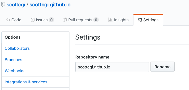 仓库名称有固定的格式: username.github.io,其中username必须是Github账户的用户名(我的是scottcgi),github.io是固定的,这个地址将会成为个人站点的网站地址。另外,我们可以勾选Initialize this repository with a README,让仓库自动创建一个README.md文件,我们用它来做站点的首页(当然也可以不创建,后面自行创建,或是建立index.html也行)。
