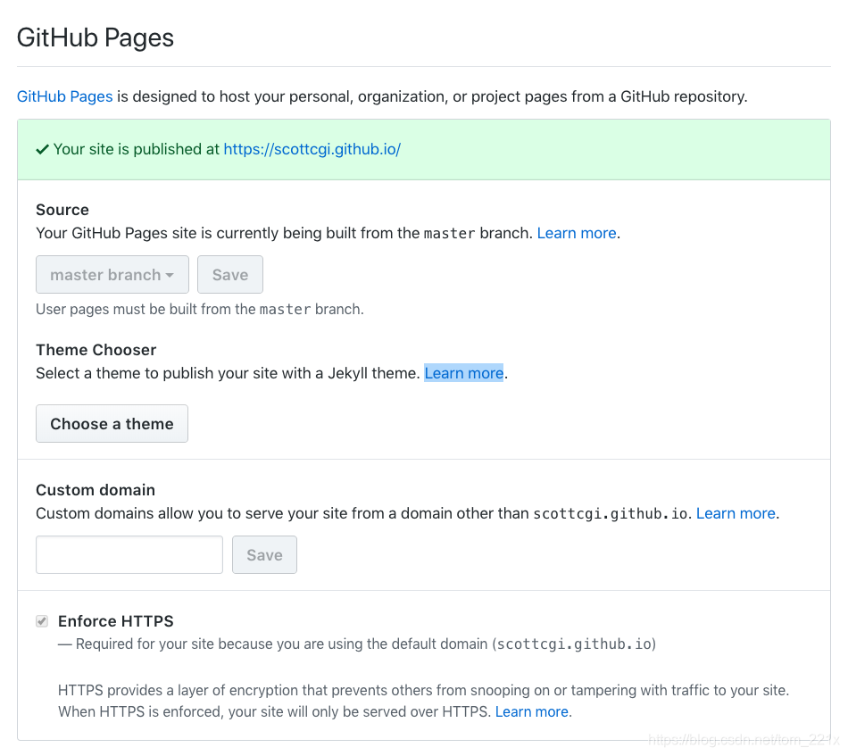 如果是username.github.io只能使用主分支,其它仓库项目可以选择其它两个。接下来Choose a theme是Github提供的内置的网站主题,选择即可应用无需其它设置。Custom domain是自定义域名,本文暂不讨论。