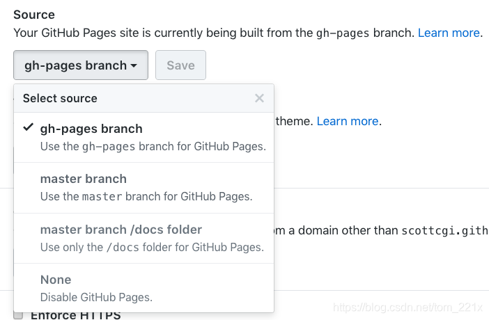gh-pages branch是项目新建一个分支命名为这个,使用这个分支来做站点内容。master branch是使用主分支也是默认的,来作为站点内容。master branch/docs folder是使用主分支的docs文件夹来作为站点内容。None就是禁用Github Pages。
