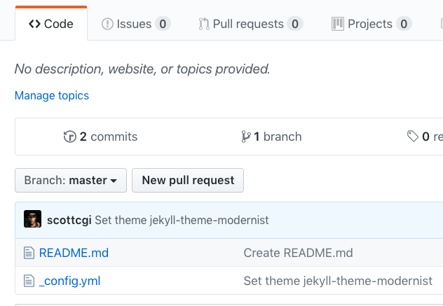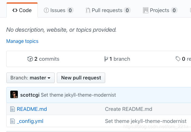 编辑README.md文件的内容,就会默认显示在网站首页,_config.yml 是jekyll的全局配置文件,现在里面只有一句话,theme: jekyll-theme-modernist。我们可以手动修改这个theme主题配置,网站就会应用不同的主题。