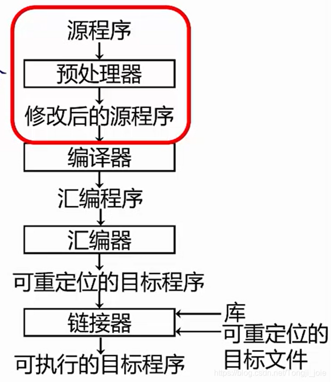 - 预处理:处理所有的#开头的文件,例如#define(替换)#include(展开)