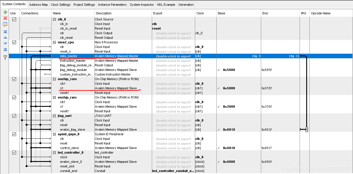 到这里我们就知道了,想要将我们自己创建的IP核的能够被NIOS II控制到话,需要将器件挂载到NIOS II的地址总线上去,然后将数据总线连接到NIOS II的数据总线,以及一些控制信号线。其实在NIOS II系统“Avalon Memery Mapped Master”就是传统的8086系统中的地址总线和数据总线。