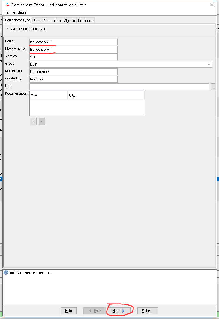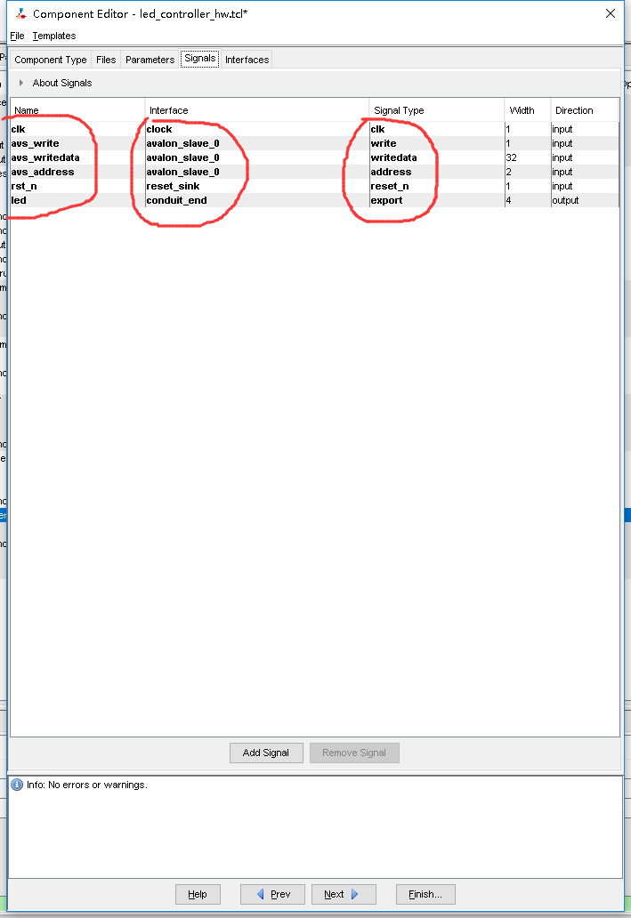 Parameters设置先略过,简单的模块不需要设计Parameters,下面设置Signals参数,Signals参数里面是根据Verilog文件中的参数来的,需要正确选择Interface和Signal Type,如图所示: