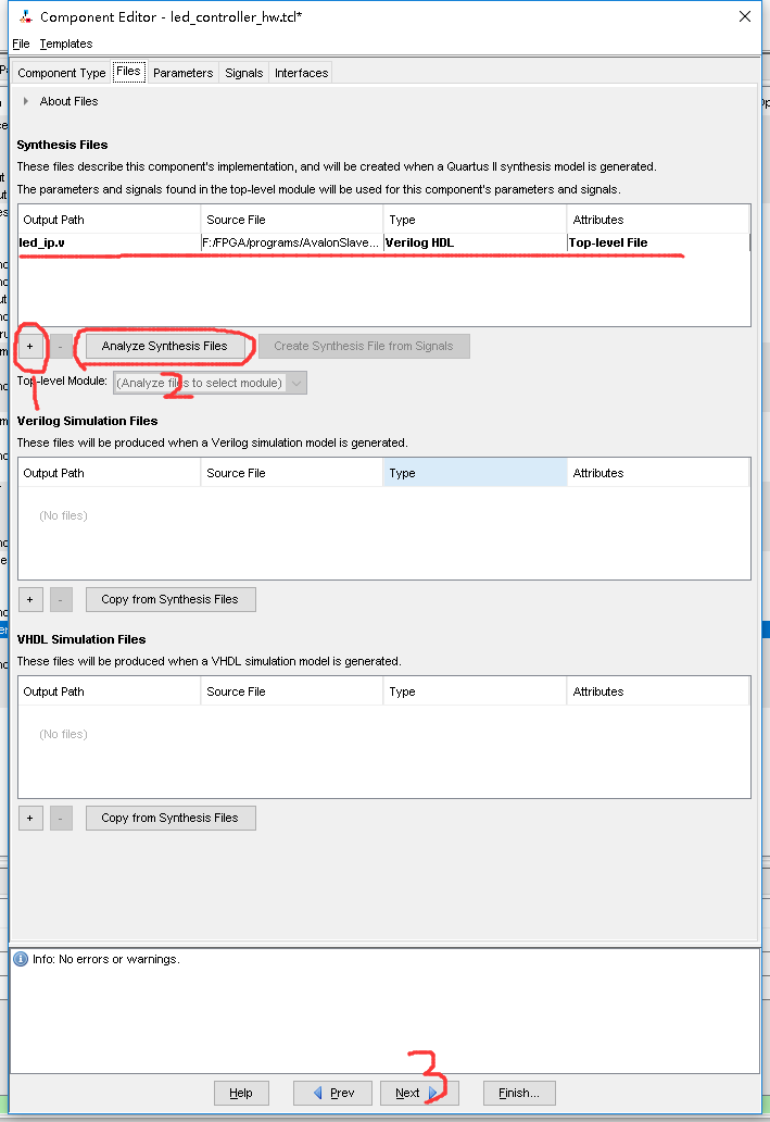 在Qsys中右击led_controller模块,电机Edit,在Files中再一次Analysis Synthesis Files,Finish之后重新Generate生成新的SOPC系统,然后到Quartus中重新编译下载......