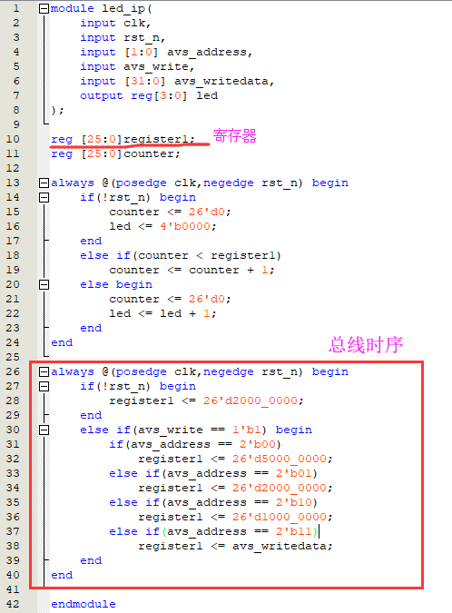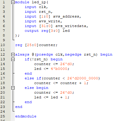 然后我们再创建一个Verilog文件,保存叫做“led_ip.v“,这个文件就是作为我们要创建的IP核的功能描述文件,在这个module的端口中添加信号:clk、rst_n、avs_address、avs_write、avs_writedata、led,其中包括了输入时钟和复位信号、“Avalon Memery Mapped Slave”总线接口、led输出端口。然后在程序中添加一个简单的LED计数器功能用于查看运行状态,程序如下: