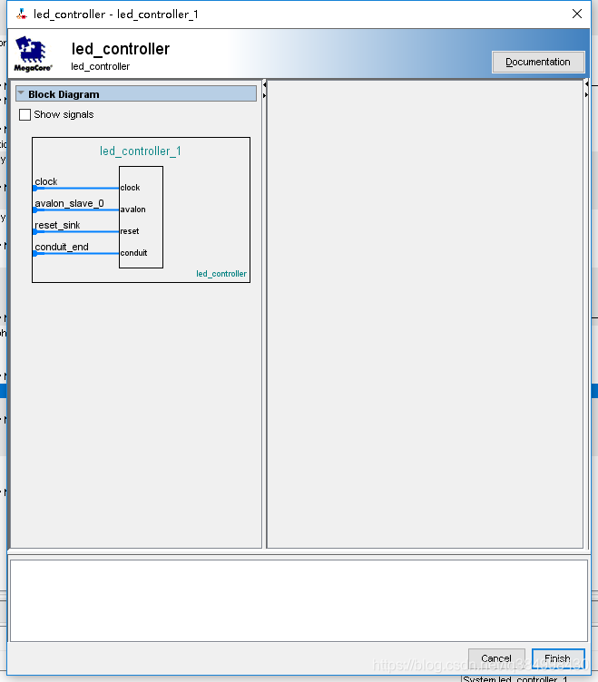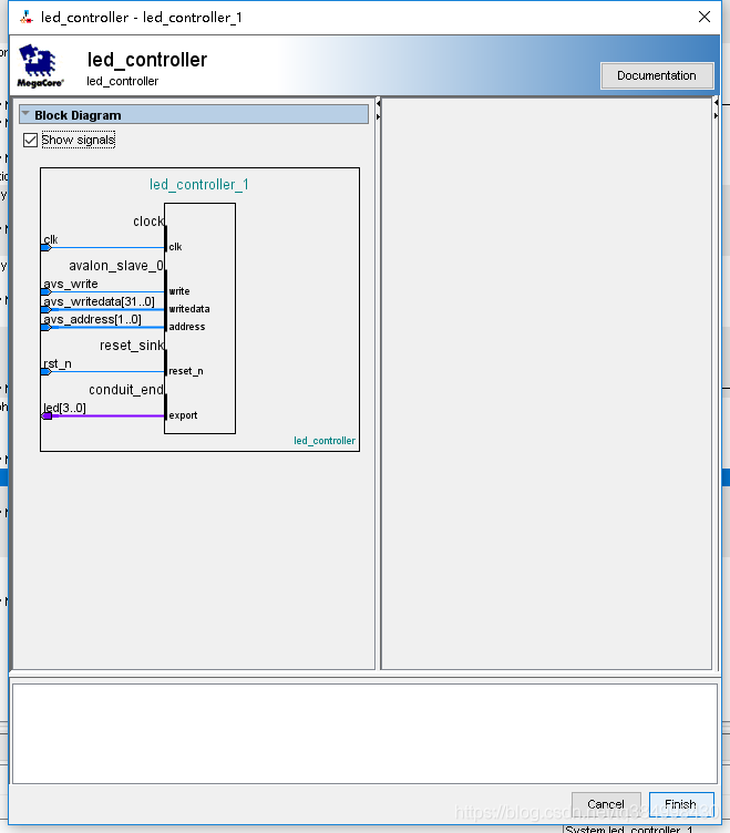 上面我们说过了要能够融合进NIOS II的系统中去,需要创建一个和“Avalon Memery Mapped Master”总线匹配的连接端口,这个端口就是“Avalon Memery Mapped Slave”了。我们先不考虑Avalon总线的时序,我们先创建一个自己的IP核,哪怕这个核没有挂载到NIOS II的总线系统上去,只是一个简单的控制LED闪烁的功能。