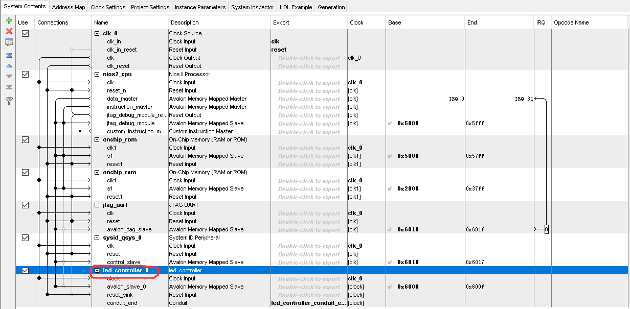 这个看起来和System Library库里面的器件很像了啊,时钟、复位、总线、export信号都有,点击Finish完成,然后连接时钟、复位和总线到之前的系统中去,选择Assign Base Address分配地址,最后效果如下图: