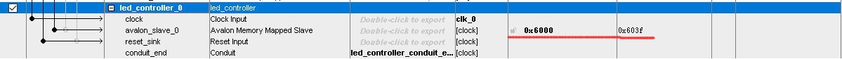 但是这个问题很奇怪,于是我修改了一下led_controller IP核,将address的宽度改成4bits,然后重新编译led_controller IP核,删除原来的led_controller器件并重新添加新的led_controller,然后重新Assign Base Address,发现地址分配变成了下图: