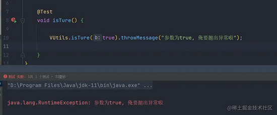 创建工具类VUtils并创建一个isTure方法,方法的返回值为刚才定义的函数式接口-ThrowExceptionFunction。ThrowExceptionFunction的接口实现逻辑为当参数b为true时抛出异常。