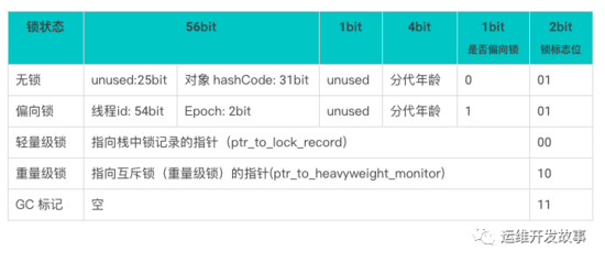 // 部分省略 // 32 bits: // -------- // hash:25 ------------>| age:4 biased_lock:1 lock:2 (normal object) // JavaThread*:23 epoch:2 age:4 biased_lock:1 lock:2 (biased object) // size:32 ------------------------------------------>| (CMS free block) // PromotedObject*:29 ---------->| promo_bits:3 ----->| (CMS promoted object) // // 64 bits: // -------- // unused:25 hash:31 -->| unused:1 age:4 biased_lock:1 lock:2 (normal object) // JavaThread*:54 epoch:2 unused:1 age:4 biased_lock:1 lock:2 (biased object) // PromotedObject*:61 --------------------->| promo_bits:3 ----->| (CMS promoted object) // size:64 ----------------------------------------------------->| (CMS free block) // // unused:25 hash:31 -->| cms_free:1 age:4 biased_lock:1 lock:2 (COOPs && normal object) // JavaThread*:54 epoch:2 cms_free:1 age:4 biased_lock:1 lock:2 (COOPs && biased object) // narrowOop:32 unused:24 cms_free:1 unused:4 promo_bits:3 ----->| (COOPs && CMS promoted object) // unused:21 size:35 -->| cms_free:1 unused:7 ------------------>| (COOPs && CMS free block) // 部分省略