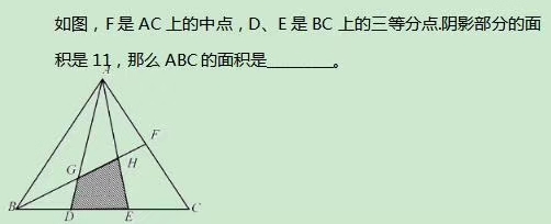 追本溯源,反推一下解题思路,首先,充分分解题干中的条件,最重要的是已知的阴影面积,要围绕它来解题,接着根据另外两个条件可知ABD,ADE,AEC三个三角形面积相等,且均为ABC的三分之一,ABF和BCF两个三角形面积相等,为ABC二分之一,这两个肯定是要用到的,再看图,一眼看去可找到AGH,BDG,AFH三个与阴影关联的三角形,接着排除AFH和BDG,为没能利用到面积的关联,所以解题关键落在三角形AGH上,根据前面分解出的条件,可列成两个等式,即为解题步骤最后的1和2等式,要解出这个等式必定要知道b,c,d之间的联系,再次看图,可发现b,c,d三角形的高是相等的,且底边在同一直线上,那就可以从底边的长度关系入手,根据几个交点易想到相似三角形,以此为目的可作出FM和DN两条辅助线,通过几个相似三角形的比例变换,最终可得出BG,GH,HF的比例等式,也就是b,c,d的面积等式,问题就解决了