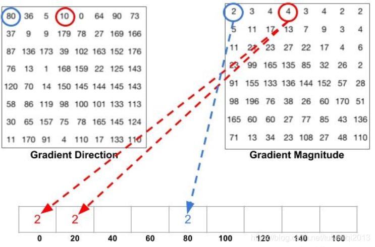 先看两个蓝色圈圈。因为蓝圈的方向是80度,大小是2,所以该点就投给80这个bin;