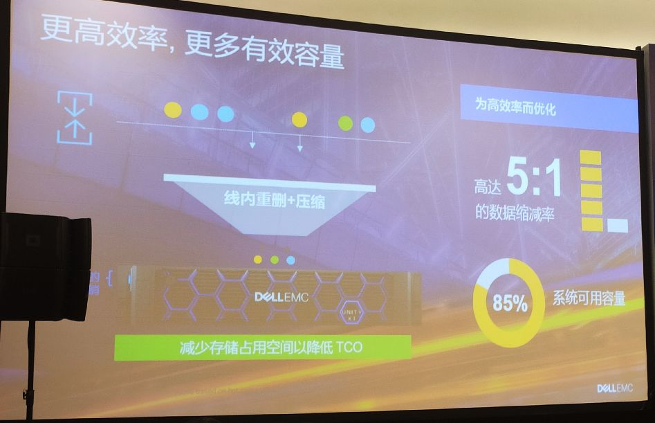 不过在相当一部分场景下,用户花同样的钱,只能配置较小容量的SSD,此时虽然性能也是足够甚至远超出机械盘,但比较无奈。针对这类场景,戴尔科技在今年6月份提出了“有效容量”的概念,同等容量下,将系统免费升级到全固态。还有这等好事?实际上,得益于戴尔科技在其存储产品内置的强大inline性能无损重删和压缩引擎,能够用更小容量的闪存存储存储更多数据,相当于把额外的容量利用计算资源补回来。