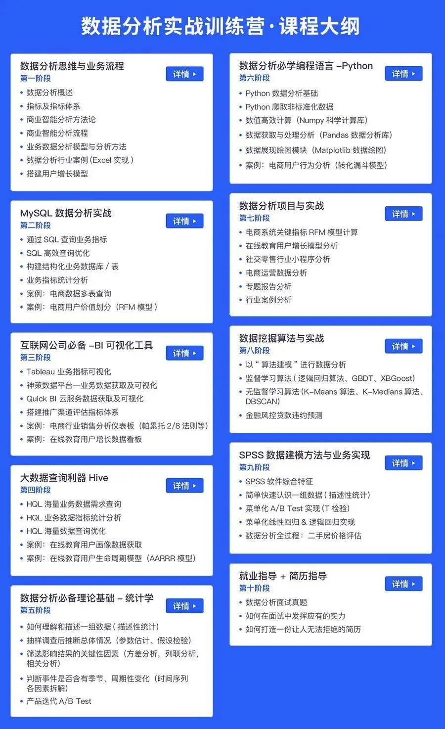 这是课程大纲,十个阶段,九大能力,从工具到方法,从思维到业务。比起只教你Python或者SQL的课程,高出了几十个段位。