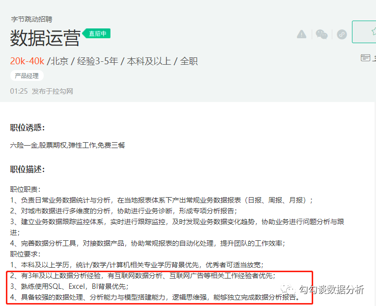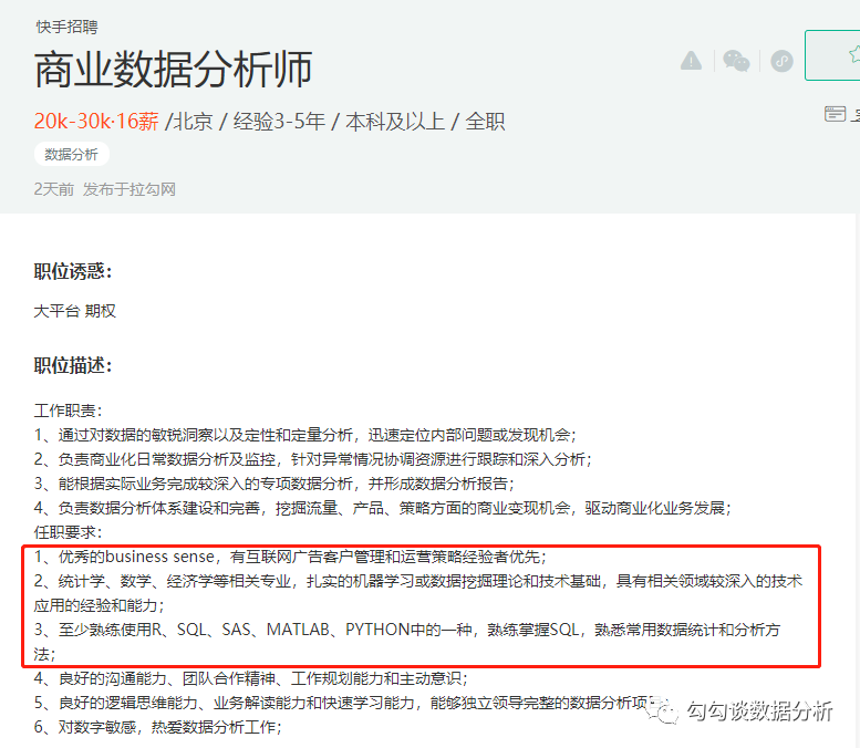如快手在招的数据分析师,就明确要求熟练使SQL、Python等技能,熟悉数据统计方法等,而字节的数据运营岗位,则更倾向于BI、模型搭建、数据分析报告等。