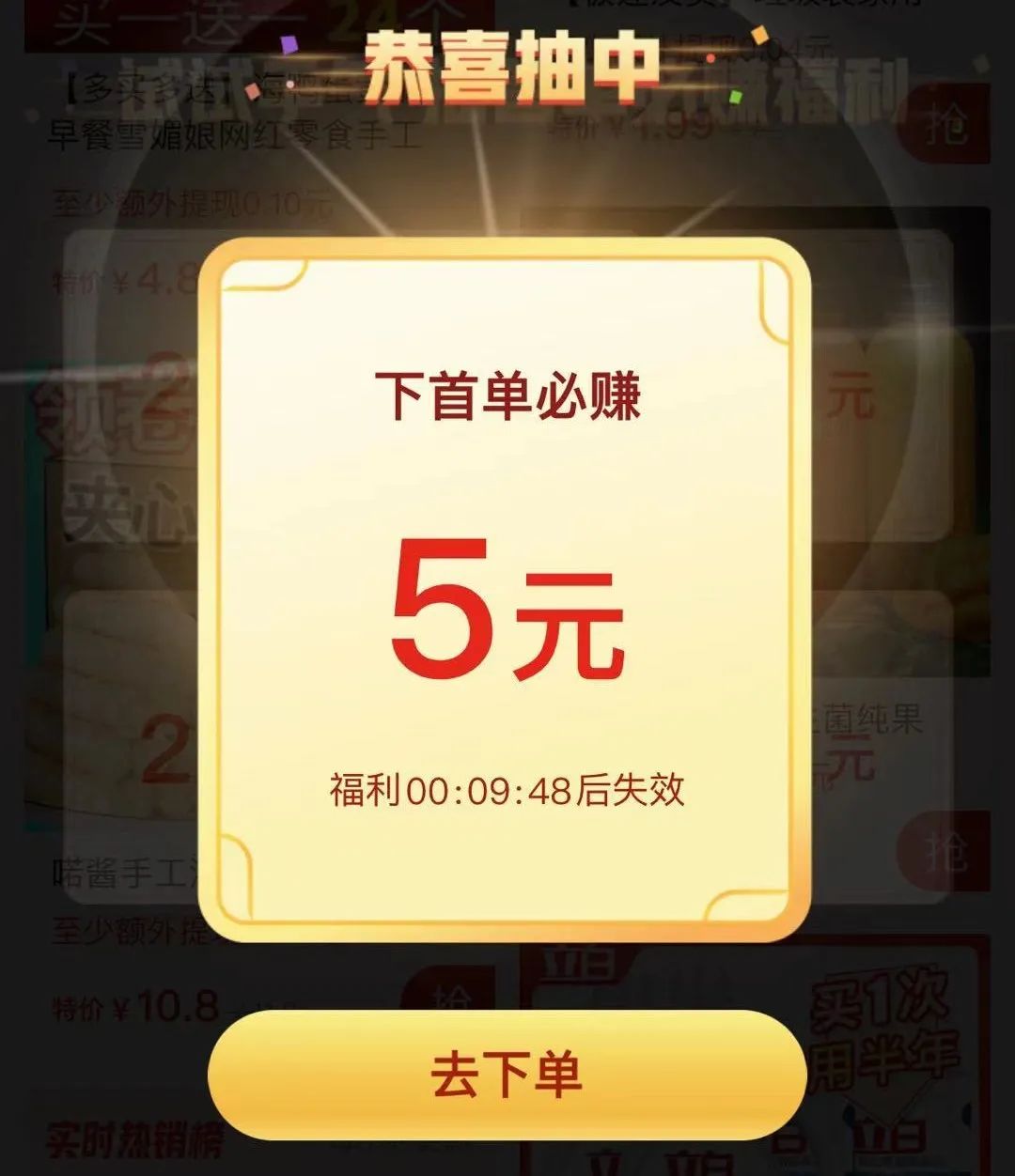 拼多多以优惠券等的形式刺激用户下单, 比如下面的下首单并赚XX元, 而且还不给你叉掉这个页面的按钮