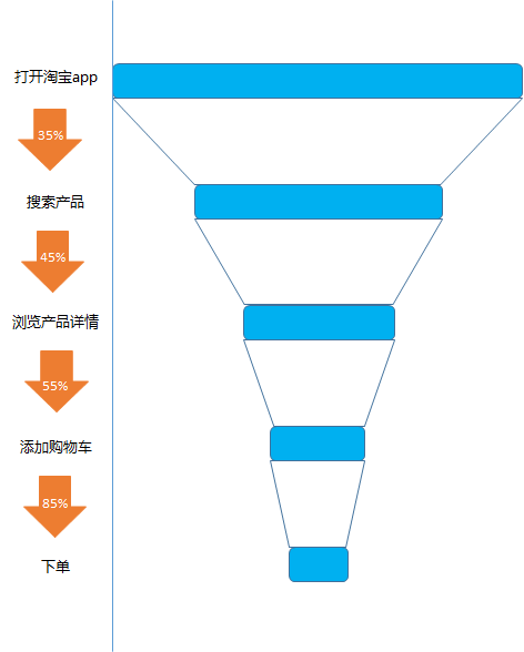 从打开淘宝app 到搜索的转化率, 从搜索产品到查看产品的详情的转化率,从查看产品到添加购物车的转化率, 从添加购物车到下单的转化率等等