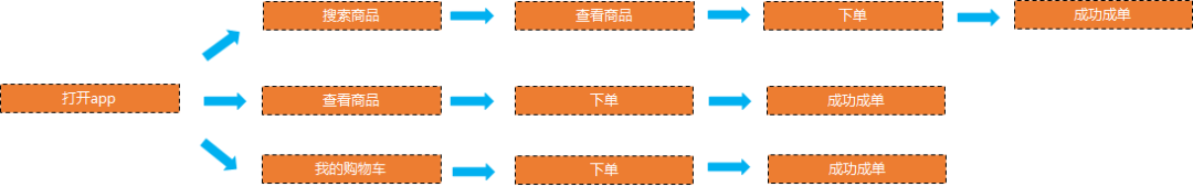 以电商app 淘宝为例, 假如我们的订单人数下降了, 这时候就需要梳理用户购买链路, 把用户从打开app 到下单的所有的链路都梳理一遍, 然后利用漏斗分析, 计算每个环节的转化率
