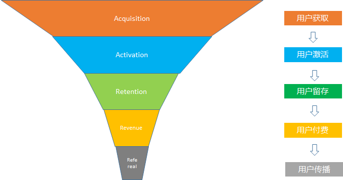 在用户增长的最出名的漏斗模型叫做AARRR, 即从用户获取, 用户激活, 用户留存, 用户付费到用户传播