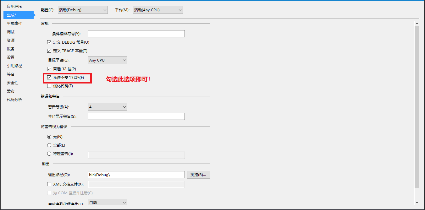 2.在项目属性界面中选择“生成”选项卡,再勾选“允许不安全代码”。
