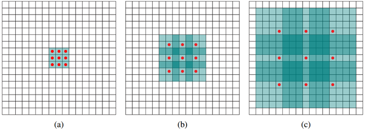 上图b可以理解为卷积核大小依然是3×3,但是每个卷积点之间有1个空洞,也就是在绿色7×7区域里面,只有9个红色点位置作了卷积处理,其余点权重为0。这样即使卷积核大小不变,但它看到的区域变得更大了。详细解释可以看这个回答:如何理解空洞卷积(dilated convolution)?